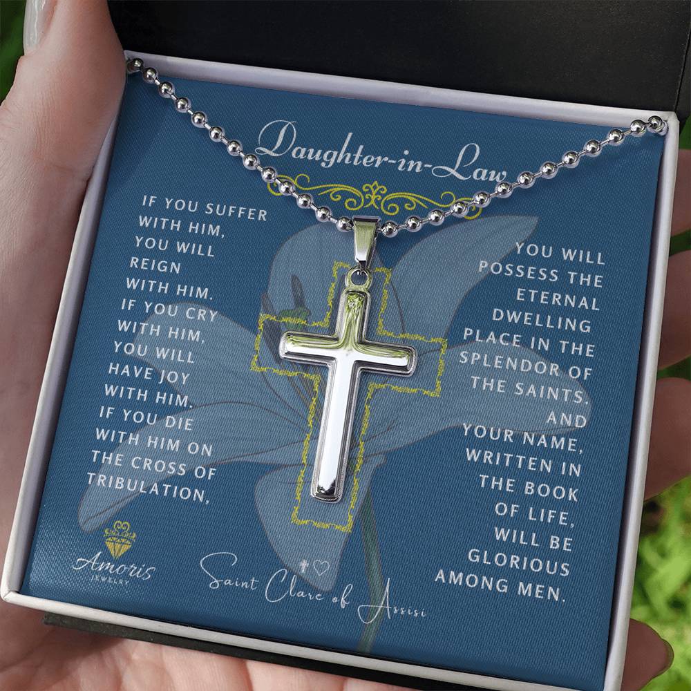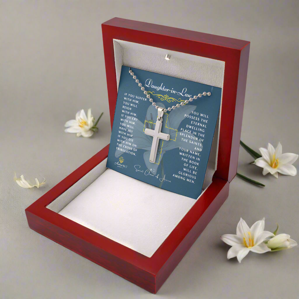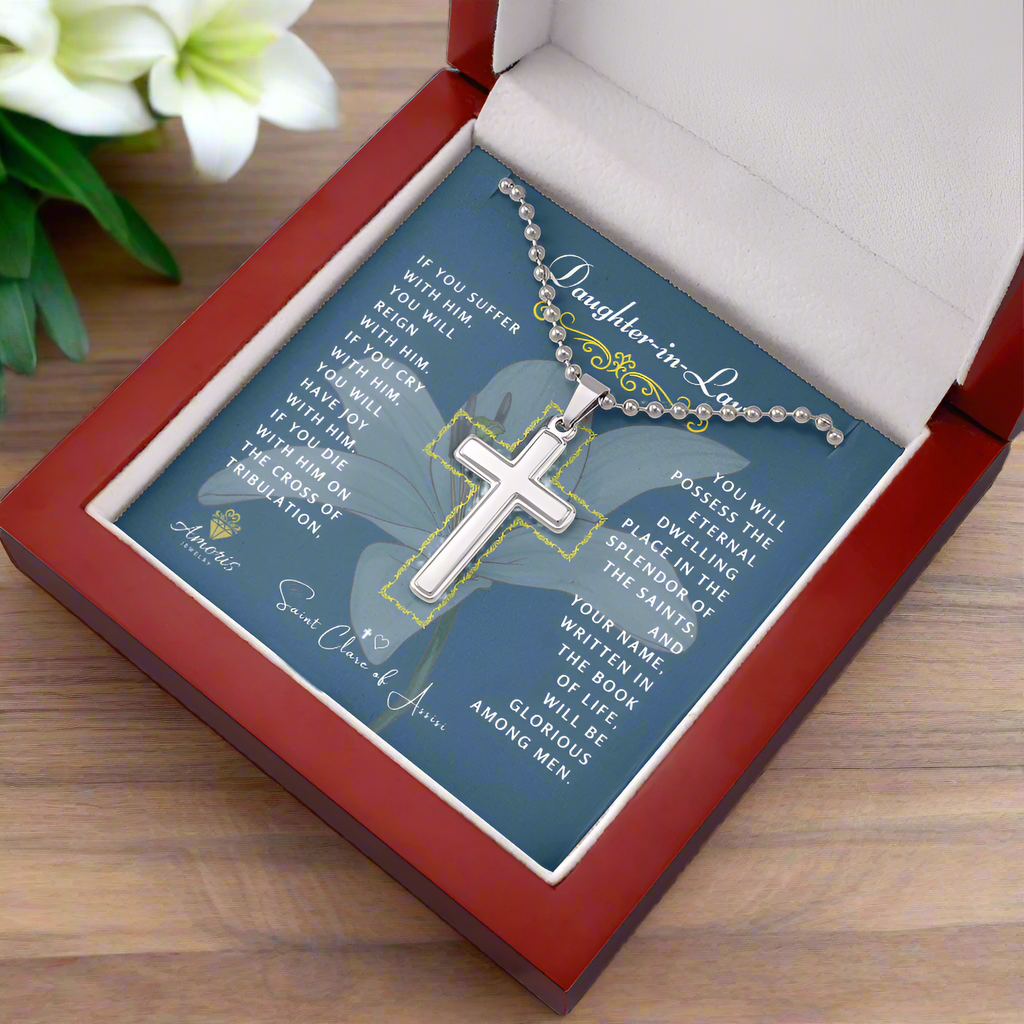 Collier croix de belle-fille avec citation de Sainte Claire d'Assise