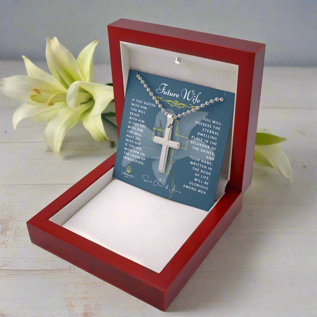 Collier croix Future Wife avec citation de Sainte Claire d'Assise