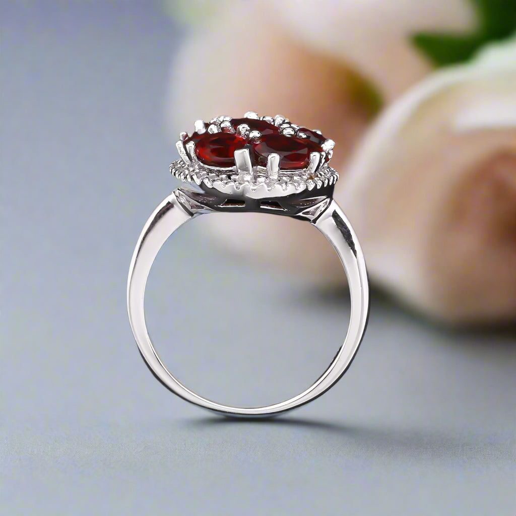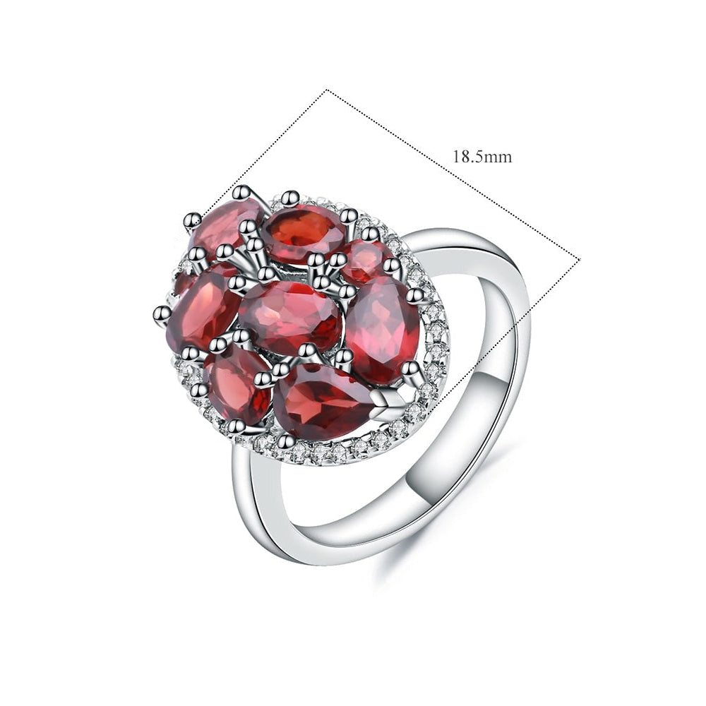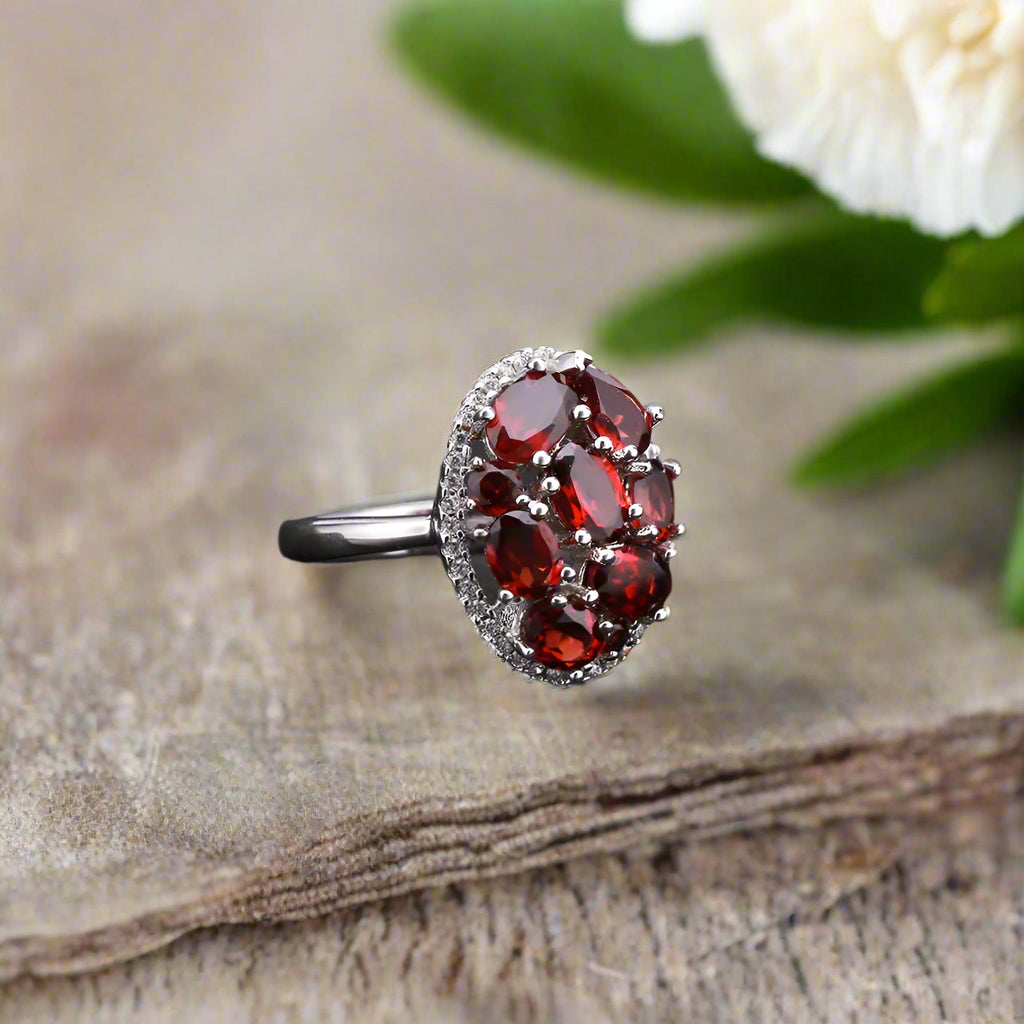Glam up any look with this stunning GRACE Gemstone Cluster Halo Ring in Sterling Silver featuring a gorgeous cluster of sparkly natural red garnet, sky blue topaz or chrome diopside stones that each boast a unique size! From 4 x 6 mm to 2 mm, this ring is sure to stand out. Plus, white CZ side stones provide an extra special touch of glam.