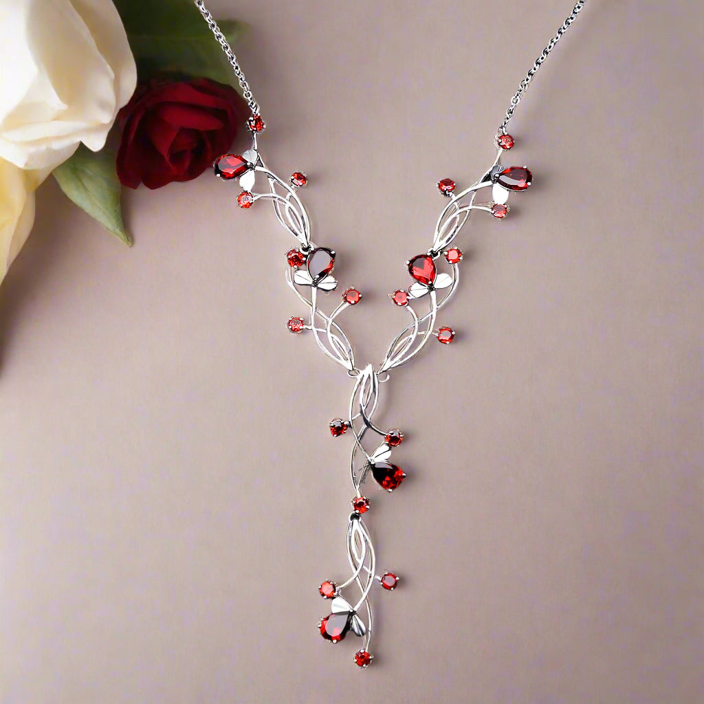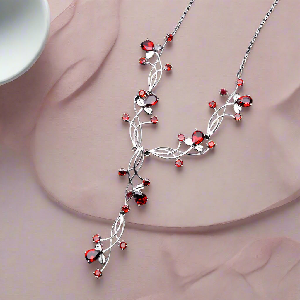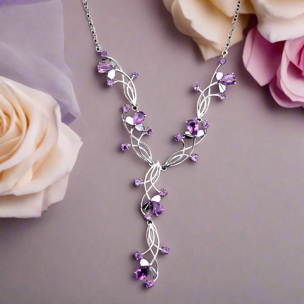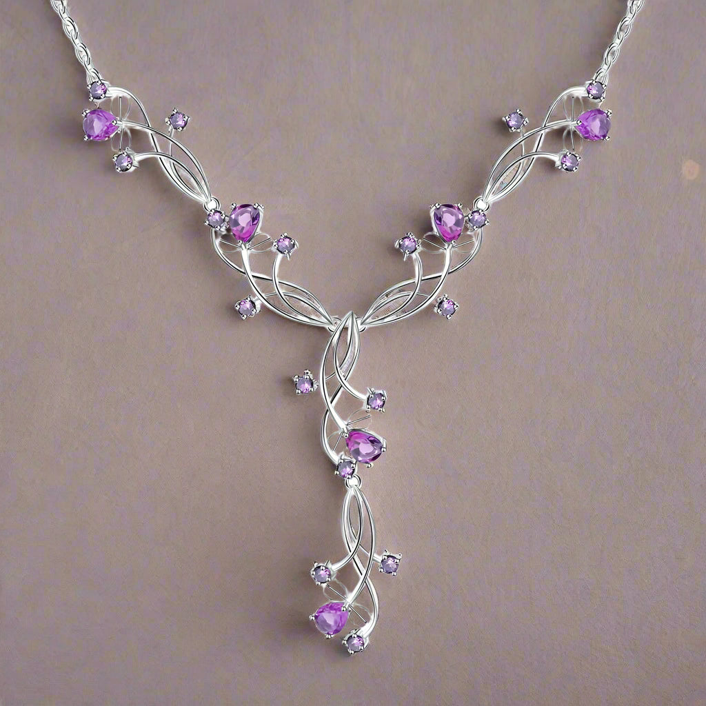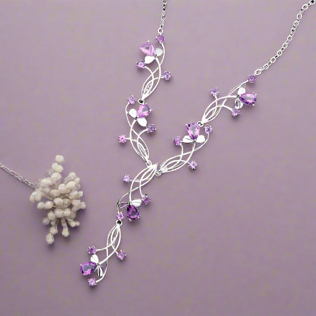 Experience the beauty of nature with this GRACE Gemstone Floral Necklace in Sterling Silver. Crafted with 925 sterling silver, this necklace features striking, natural pear-shaped stones for an elegant and timeless look. Embark on a journey with this classic, vintage style!