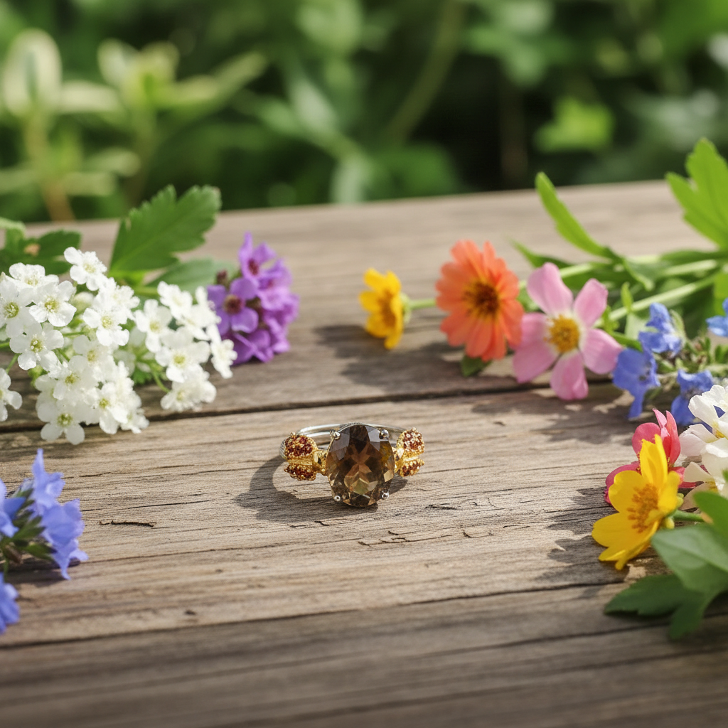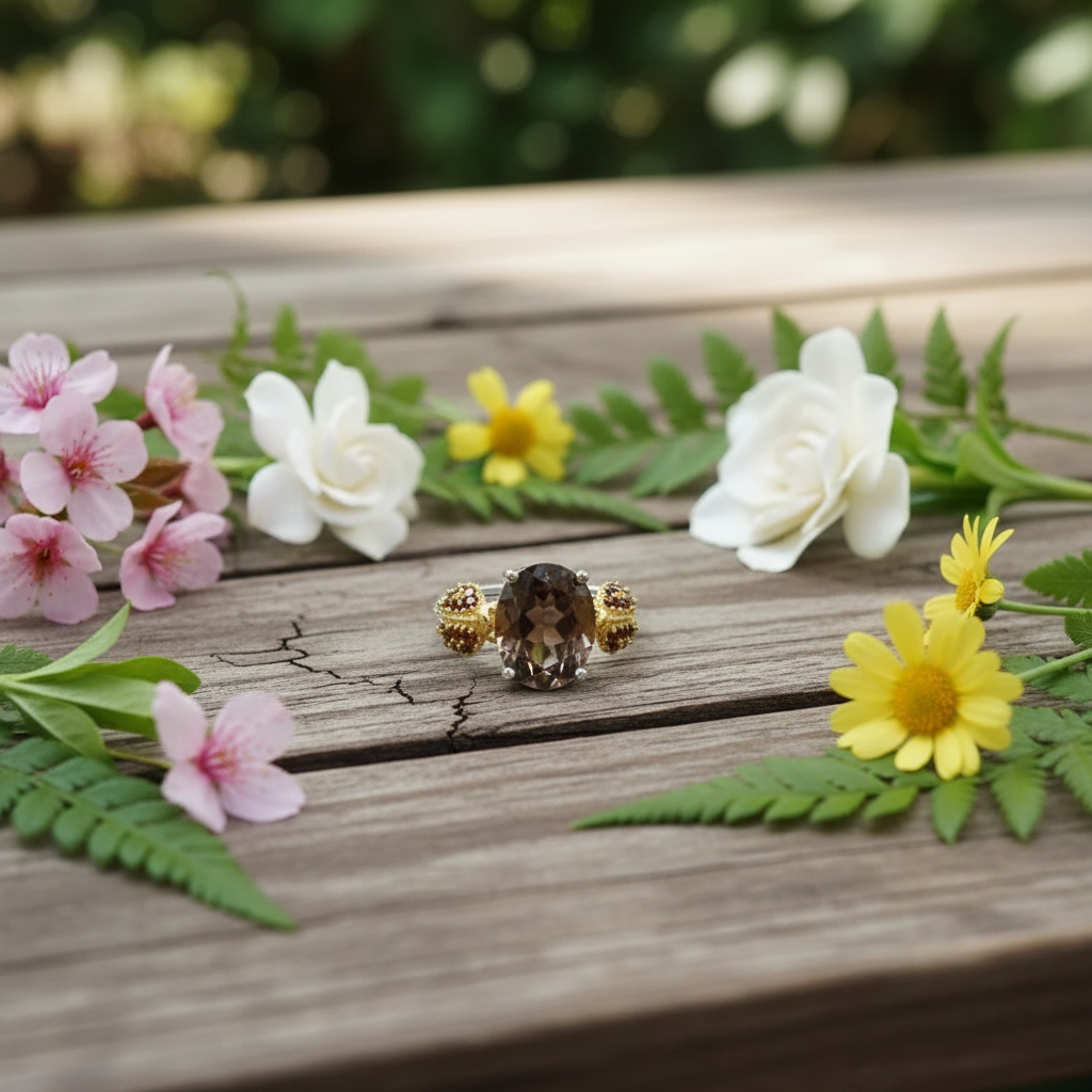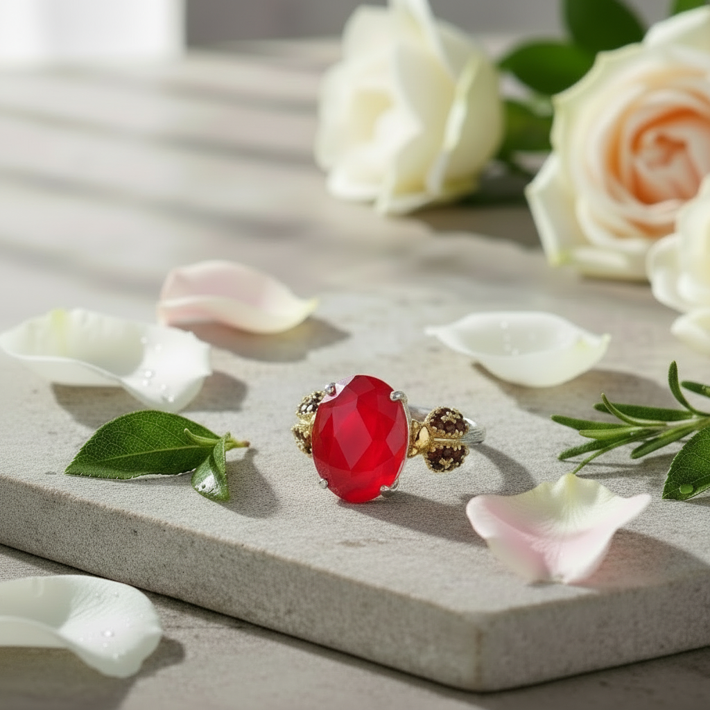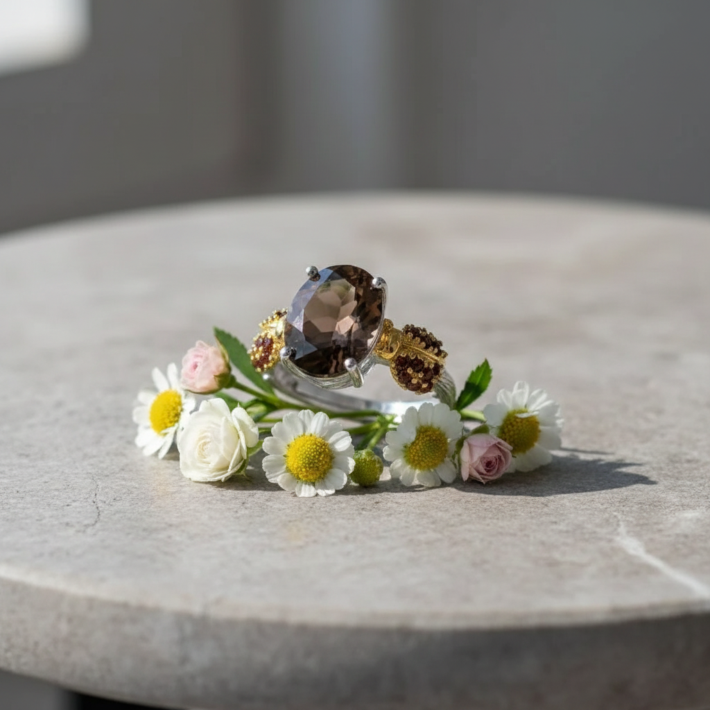 Bague ajustable GRACE en argent sterling avec agate rouge ovale et quartz fumé et coccinelle