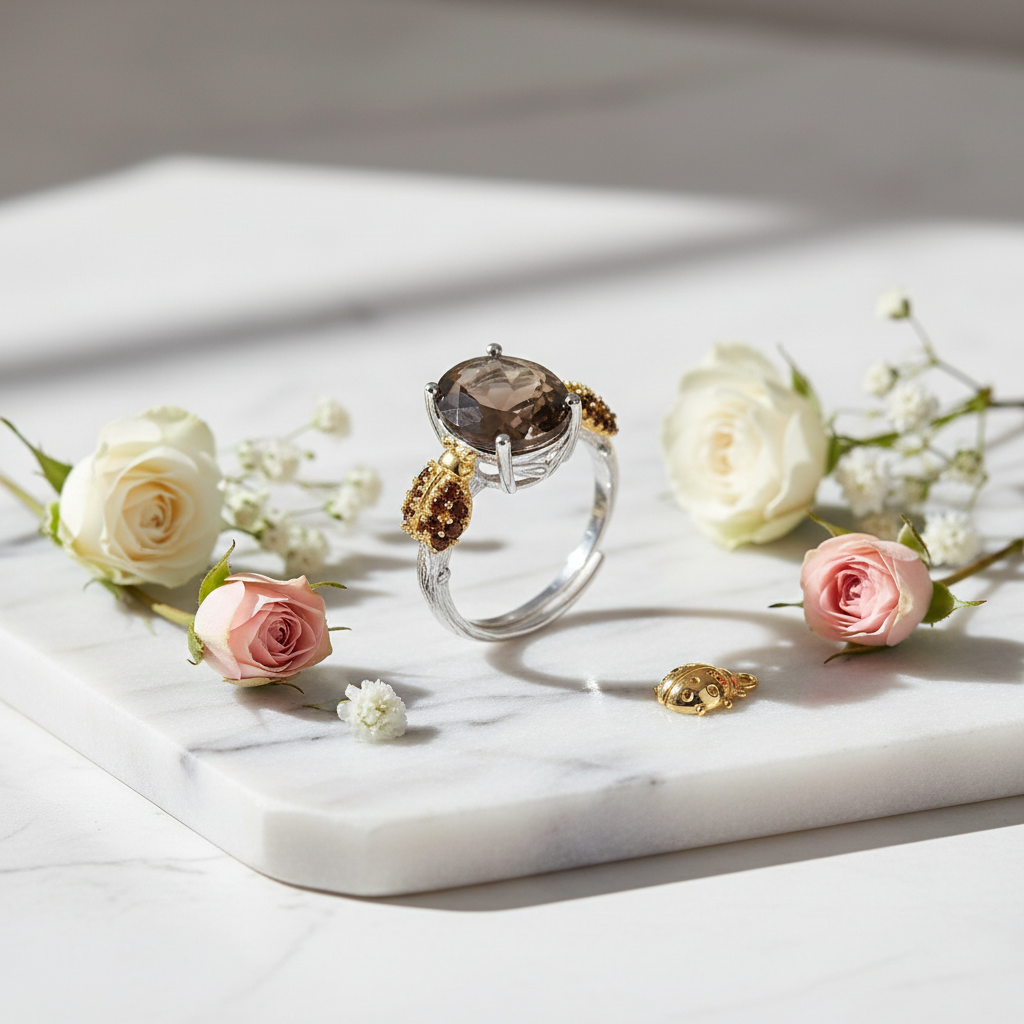Cette élégante bague de la collection GRACE en argent sterling 925 arbore des détails coccinelles accrocheurs sur une monture ovale en agate rouge ou en quartz fumé. Idéale pour offrir et polyvalente, sa conception ajustable s'adapte parfaitement à tous les looks.
