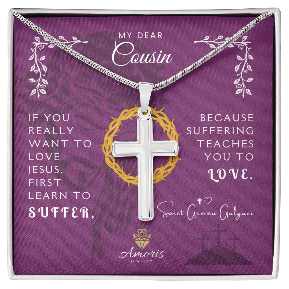 Collier croix artisanal « Mon cher cousin » avec citation de Sainte Gemma Galgani