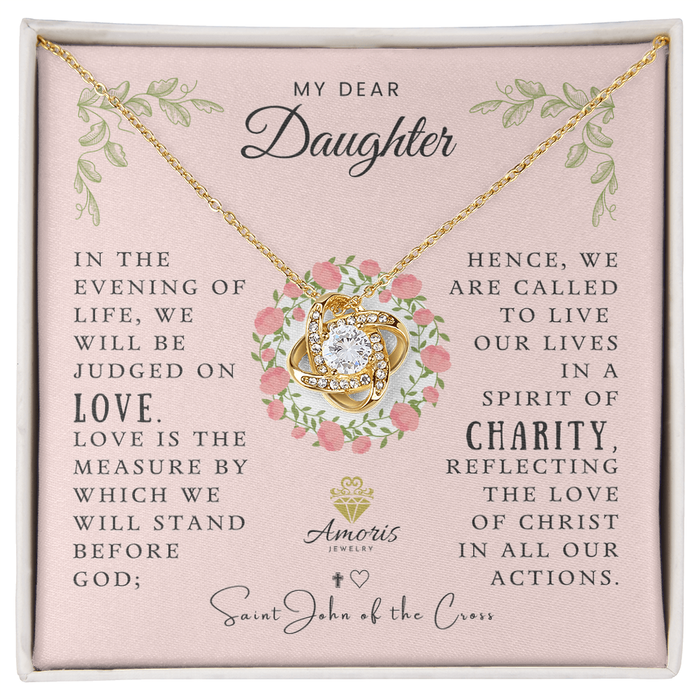 Collier « Ma chère fille » avec un nœud d'amour et une citation de Saint Jean de la Croix