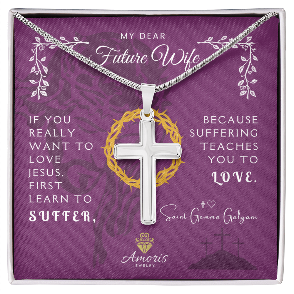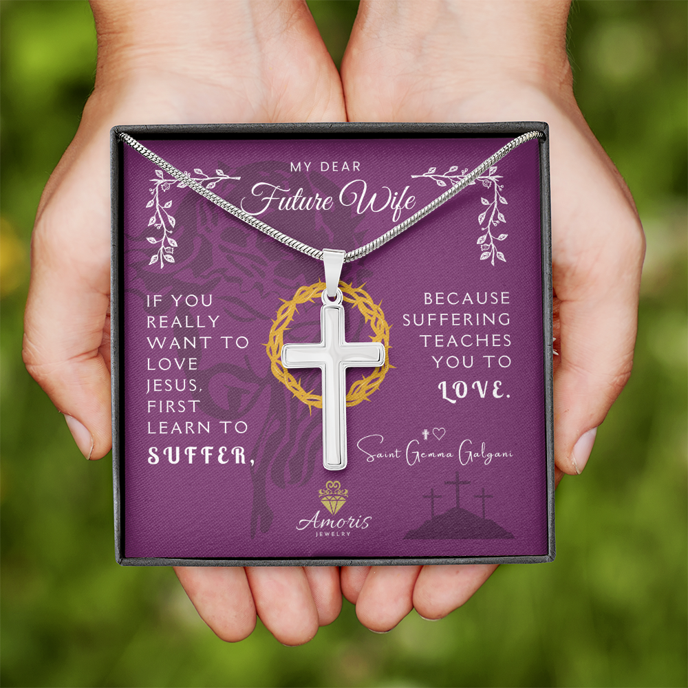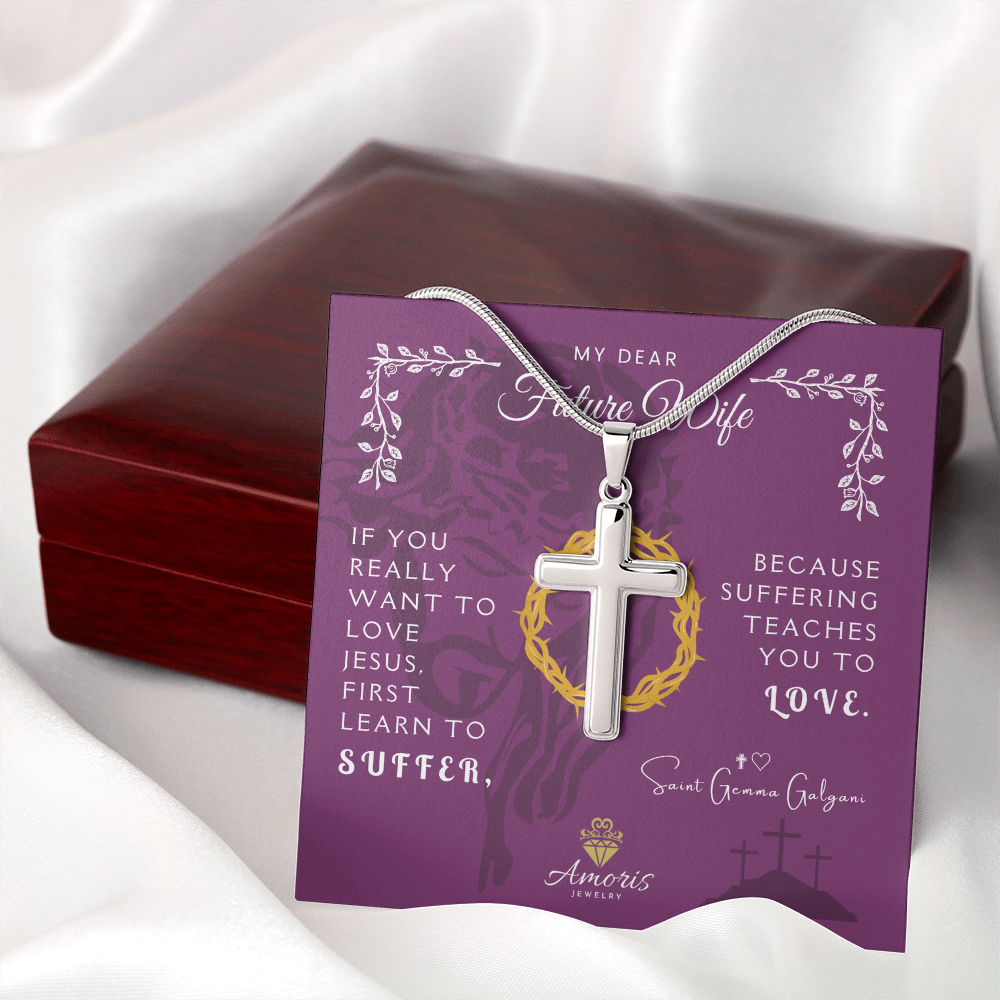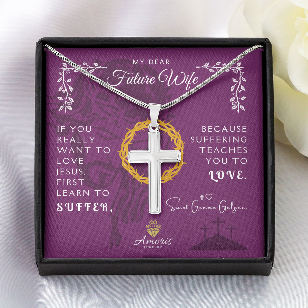 Collier croix artisanal « Ma chère future épouse » avec citation de Sainte Gemma Galgani