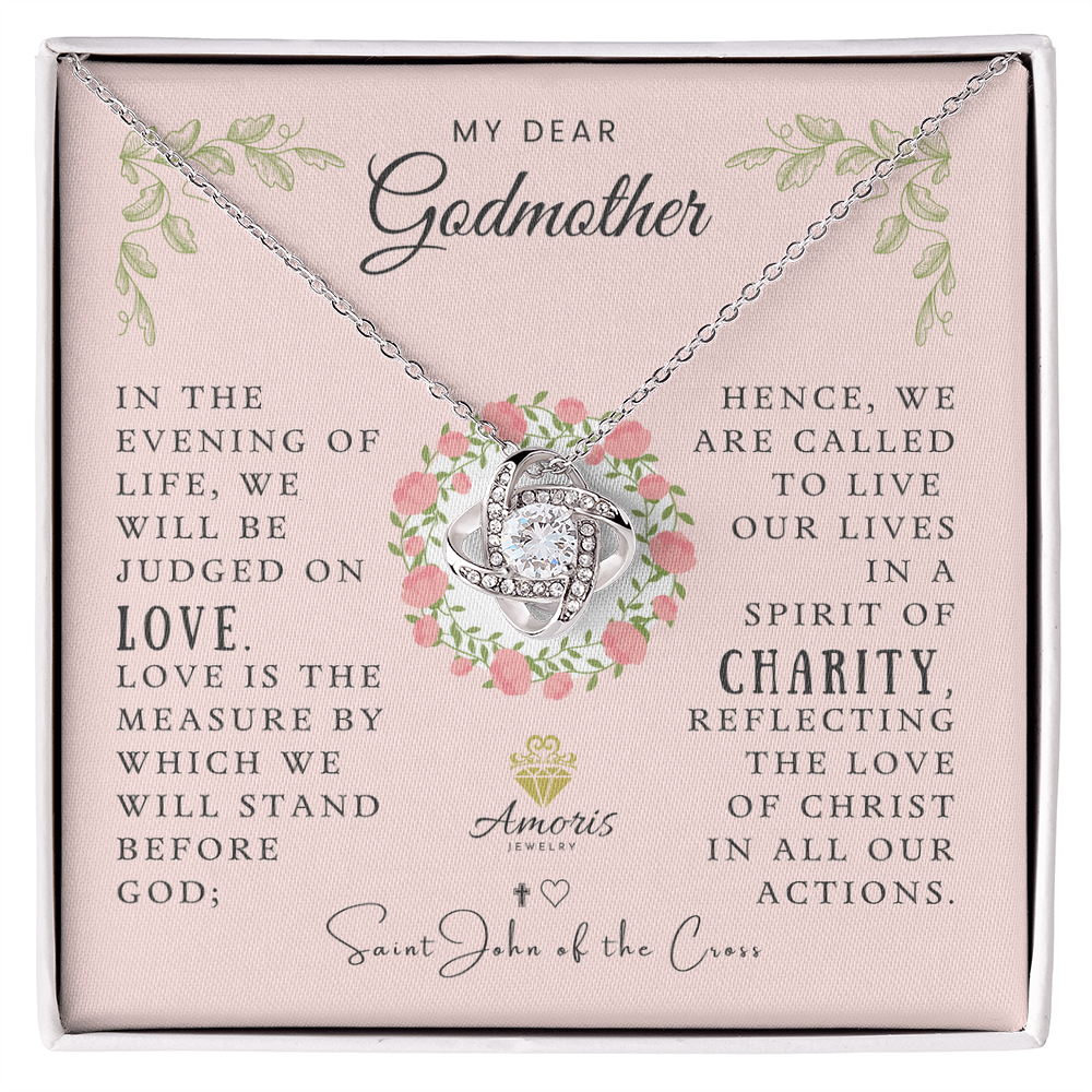 Collier avec nœud d'amour « Ma chère marraine » et citation de Saint Jean de la Croix