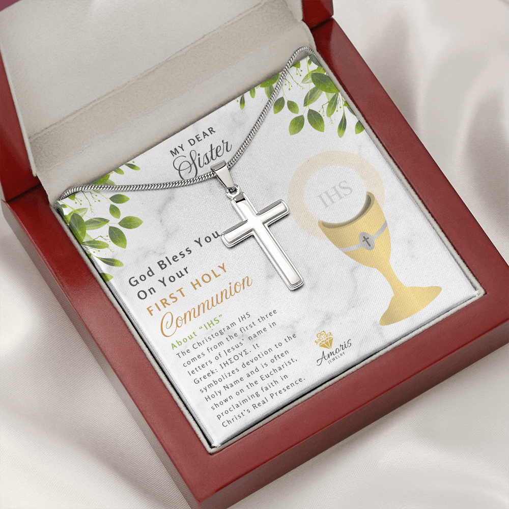 Commemorate the holy occasion of First Holy Communion with this beautifully crafted Personalized Cross Necklace. A symbol of Christ’s love and sacrifice, this necklace serves as a daily reminder of the deep spiritual journey begun through the Holy Eucharist. With a thoughtfully designed card to honor this holy milestone, it makes a cherished gift for a loved one receiving this Blessed Sacrament.