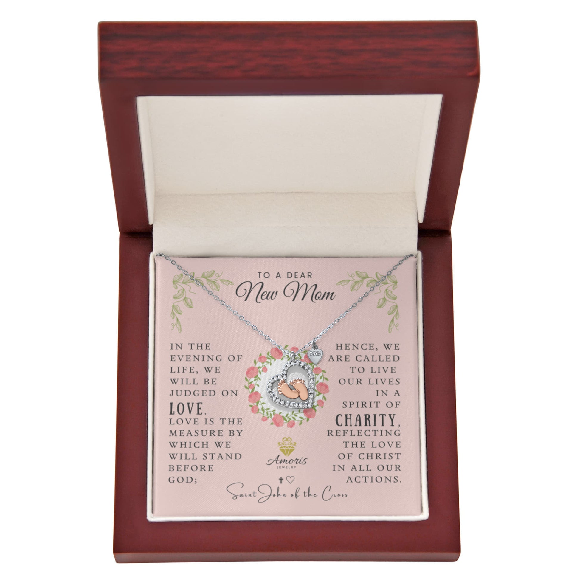 Collier en forme de cœur avec des pieds de bébé et une citation de Saint Jean de la Croix pour une chère nouvelle maman