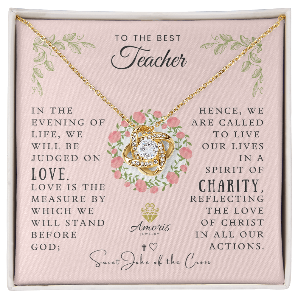 Collier « Au meilleur professeur » avec un nœud d'amour et une citation de Saint Jean de la Croix