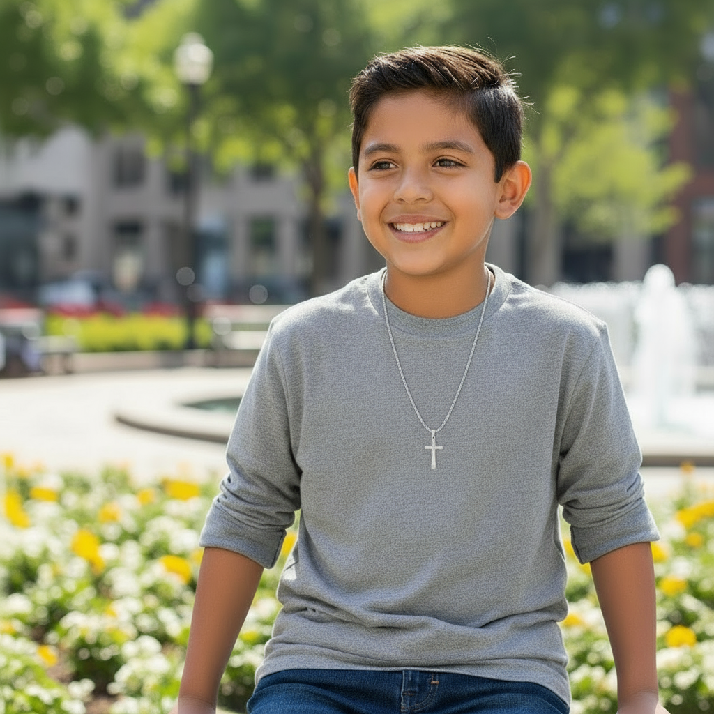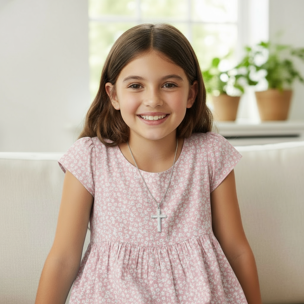 Commemorate the holy occasion of First Holy Communion with this beautifully crafted Personalized Cross Necklace. A symbol of Christ’s love and sacrifice, this necklace serves as a daily reminder of the deep spiritual journey begun through the Holy Eucharist. With a thoughtfully designed card to honor this holy milestone, it makes a cherished gift for a loved one receiving this Blessed Sacrament.