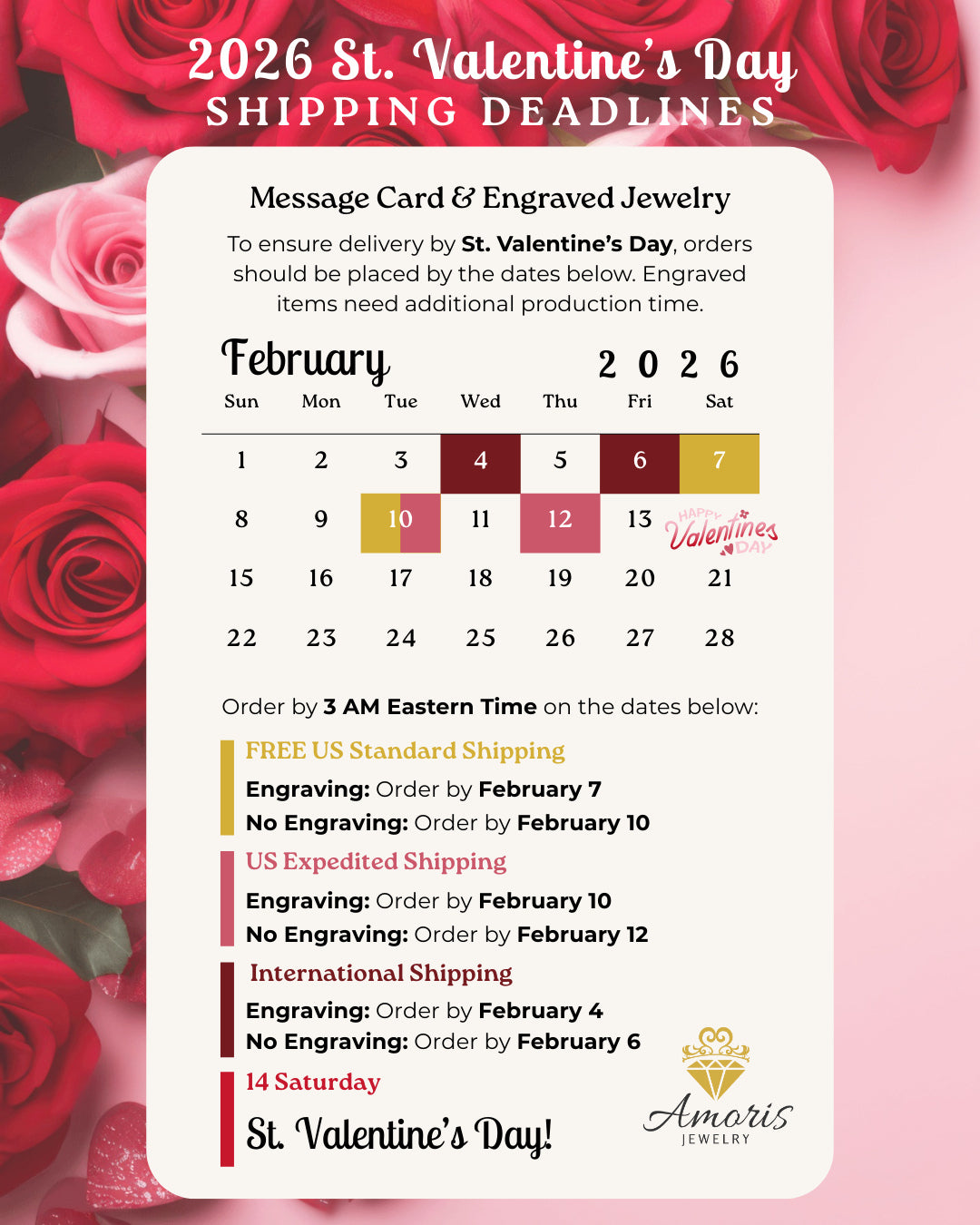 This applies to our Message Card Jewelry items with no engraving. Engraved pieces will need more time to arrive by St. Valentine's Day.