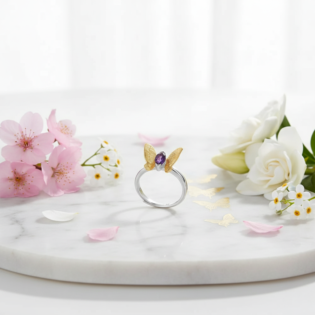 GRACE Amethyst Gold Butterfly Adjustable Ring in Sterling Silver