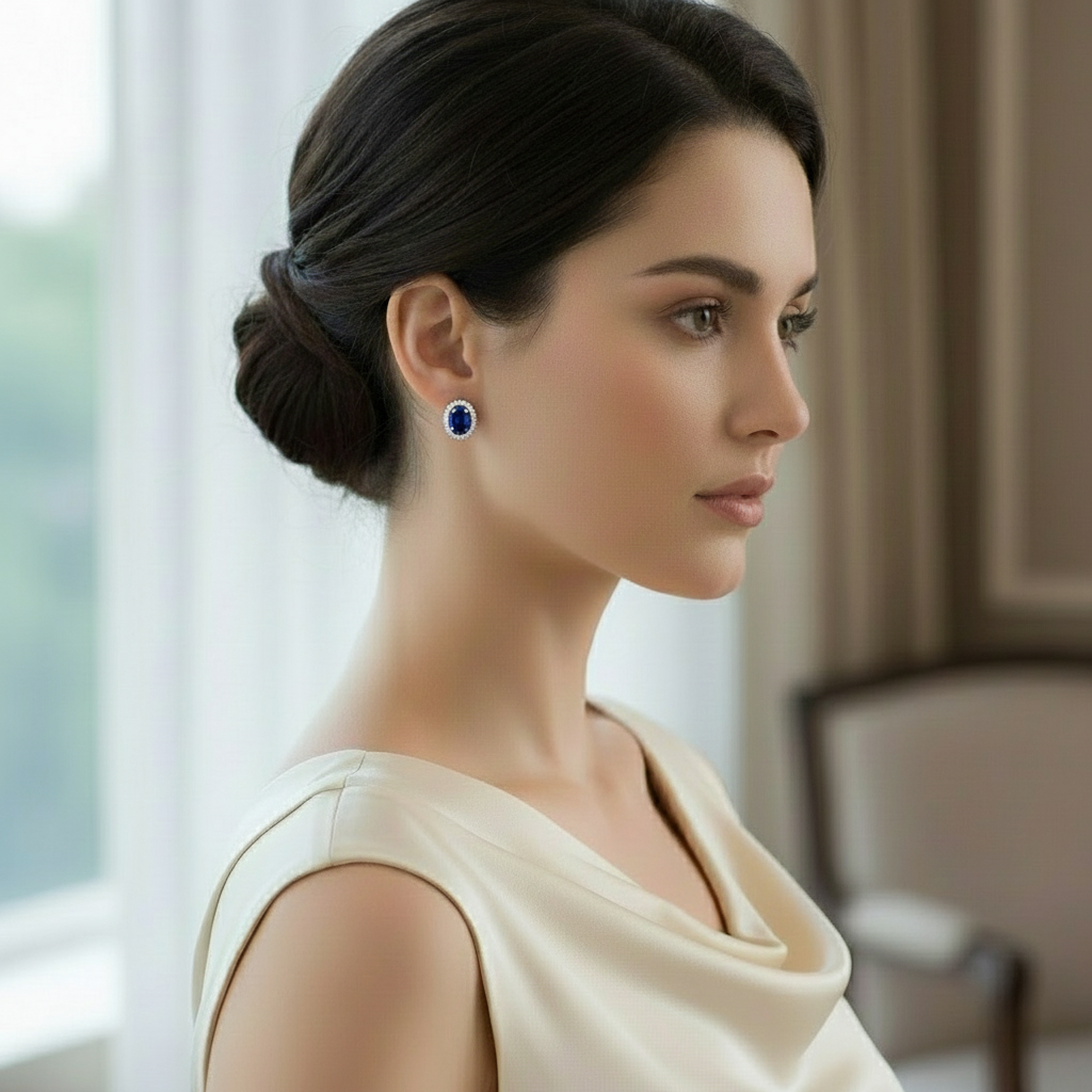 GRACE Oval Blue Sapphire Halo Stud Earrings in Sterling Silver