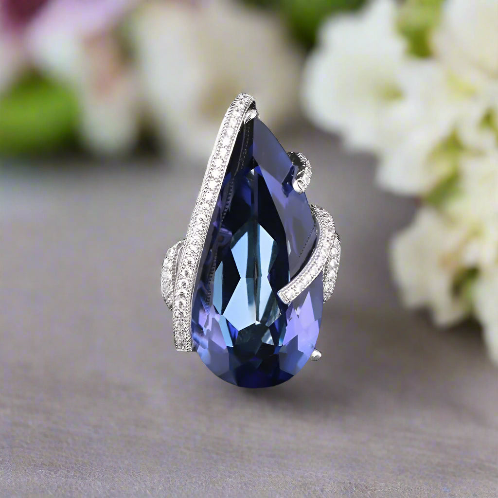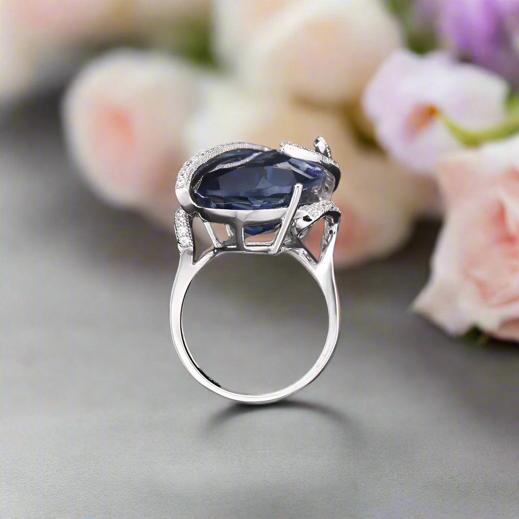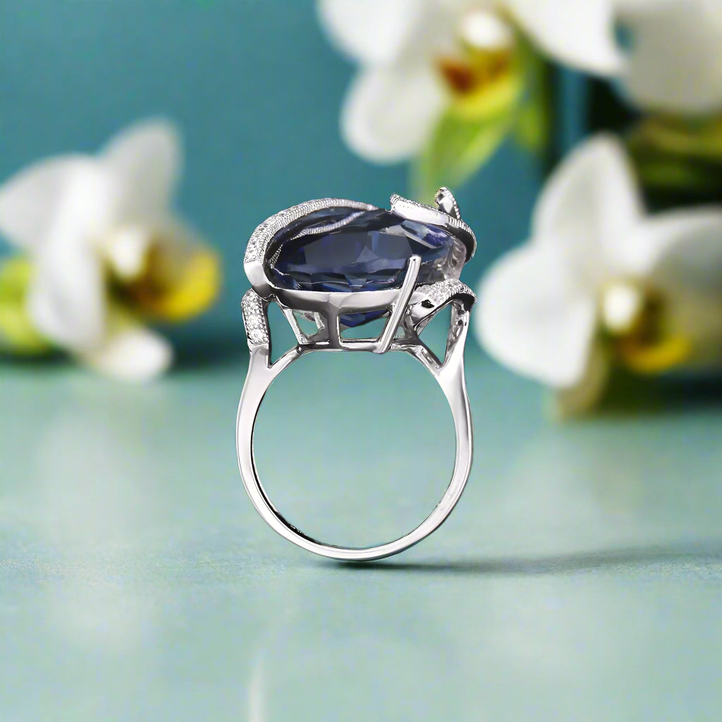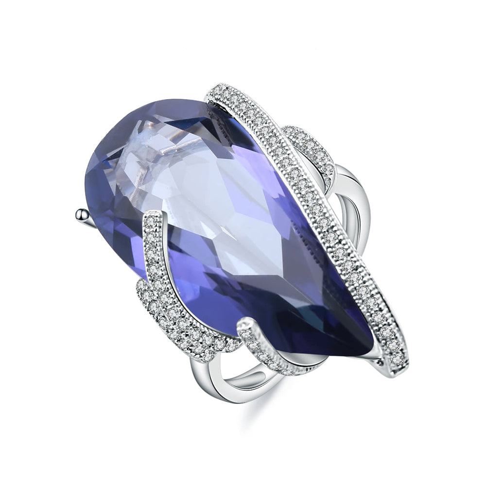 Gracefully crafted from high-quality 925 sterling silver, the GRACE Pear Cut Iolite Blue Mystic Quartz Ring exudes luxury and sophistication. Its natural 14 x 28 mm pear-shaped stone, featuring a stunning 17.8 CT. carat weight, is secured by a prong setting and complemented by sparkling white CZ side stones. With its classic style and stunning design, this ring is sure to elevate any outfit to new levels of elegance.