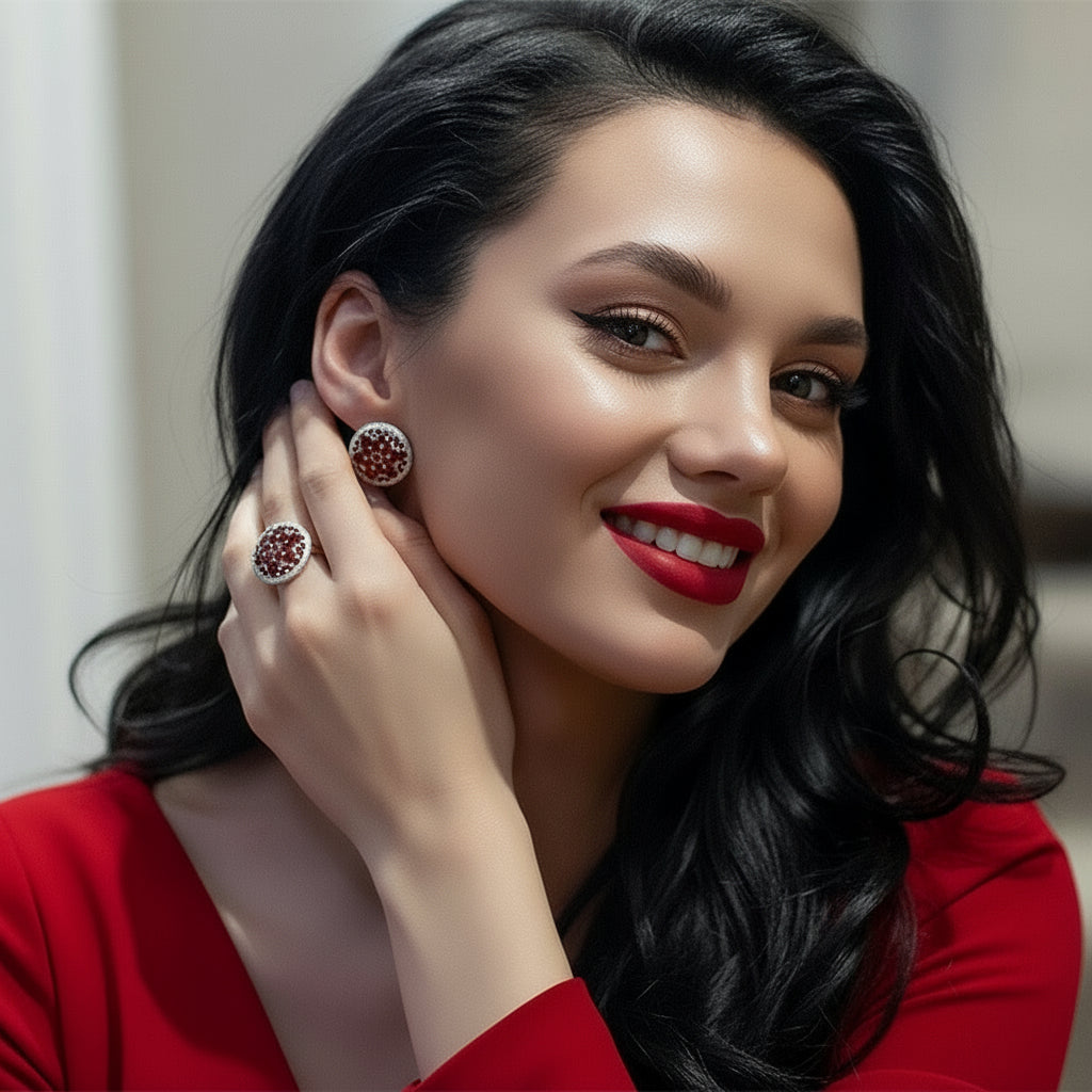 GRACE Red Garnet Round Cluster Earrings Ring Set in Sterling Silver