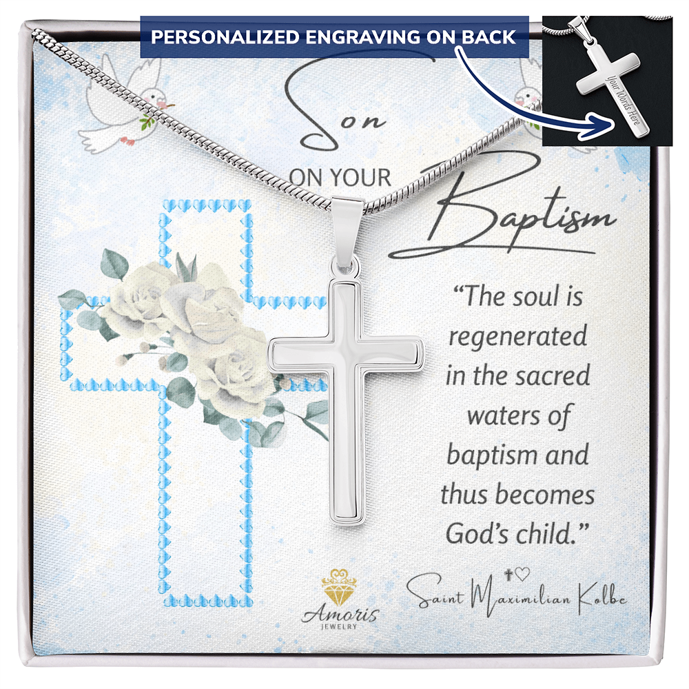 Celebrate the sacred occasion of Baptism with this beautifully crafted Personalized Cross Necklace. A symbol of Christ’s love and sacrifice, this necklace — presented with a thoughtfully designed card to honor this holy milestone — makes a meaningful gift for a special boy on his Baptism day.